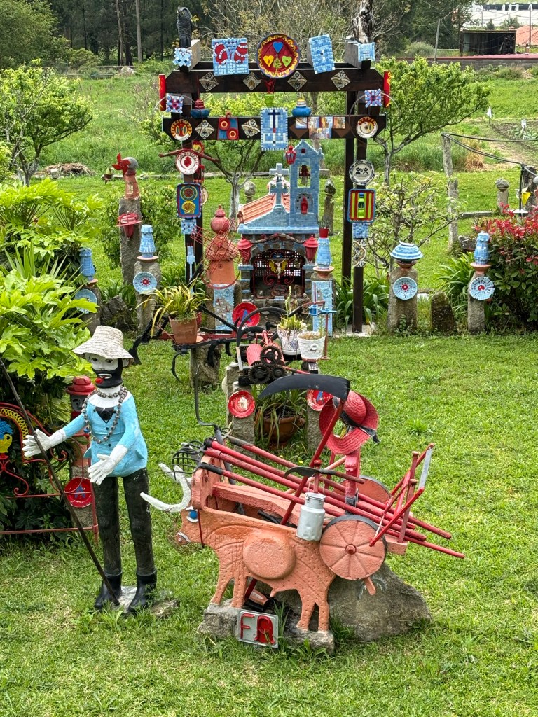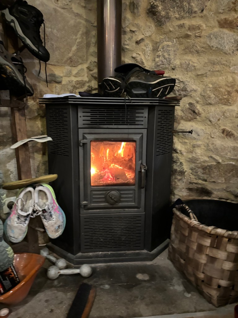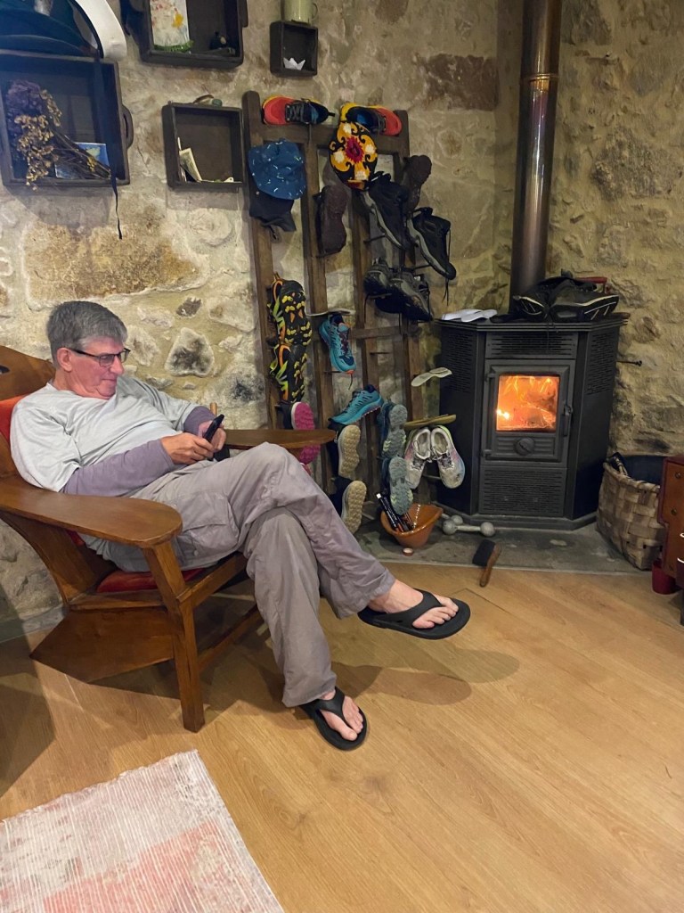 I am walking the Coastal path today. I have been walking the Litoral for the last four days. The Litoral is a boardwalk right along the beach. It is very windy and the scenery is beach, after beach, after beach. I needed a break so I decided to walk the Coastal path which as you can see is a couple of kilometers east of the coast.Interesting garage.This is typical of the Coastal Path today.There has been so much rain lately that some of the foot bridges are flooded. We had to cross this foot bridge.The water was only about six inches deep but it was cold and fast moving. I took off my shoes and socks and carefully walked across this flooded foot bridge.This is a fellow pilgrim crossing the bridge.This is some sort of alburgue where you work as an agricultural laborer for your room and board. That doesn’t sound like a lot of fun.Amazing detail at the top of the gate to the agricultural alburgue.Somebody got a little carried away with this yard art.I finally arrived at my alburgue, Casa Sardeo, Lizard House. It is an oasis in the middle of nowhere.And they have cold mini beers for a buck. I might never leave. This is my lower bunk for tonight. Clean sheets and a blanket. I am in heaven.As the evening winds down I am sitting by the wood burning stove at the alburgue.Me finishing my blog.