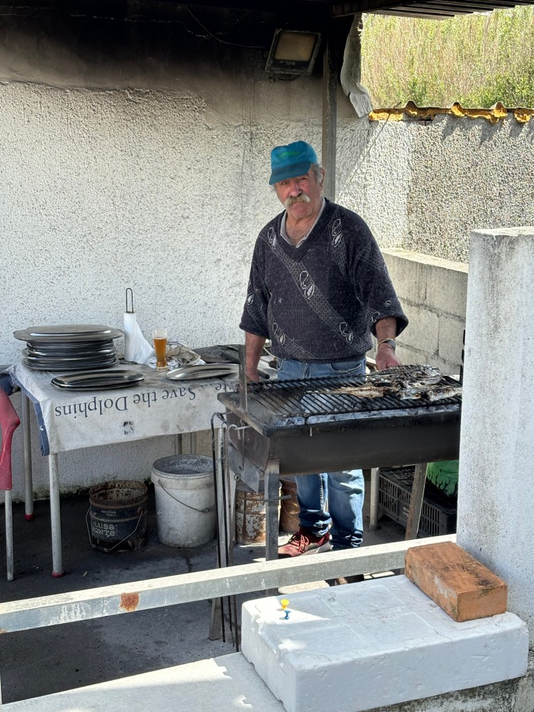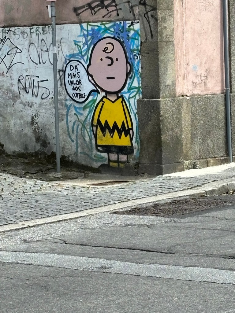 This is grandpa grilling my fish.And this is my lunch. I don’t know what kind of fish it was but it was delicious.Charlie Brown in Vila do Conde. This is for my mom. We both love Charlie Brown. This is the bunk room at the Alburgue Santa Clara in Vila do Conde. I have the lower bunk on the right hand side. The hospitalera who checked me in assured me that she saves the bottom bunks for old geezers like me. Thank God! This is a pretty good deal for 10 euros.