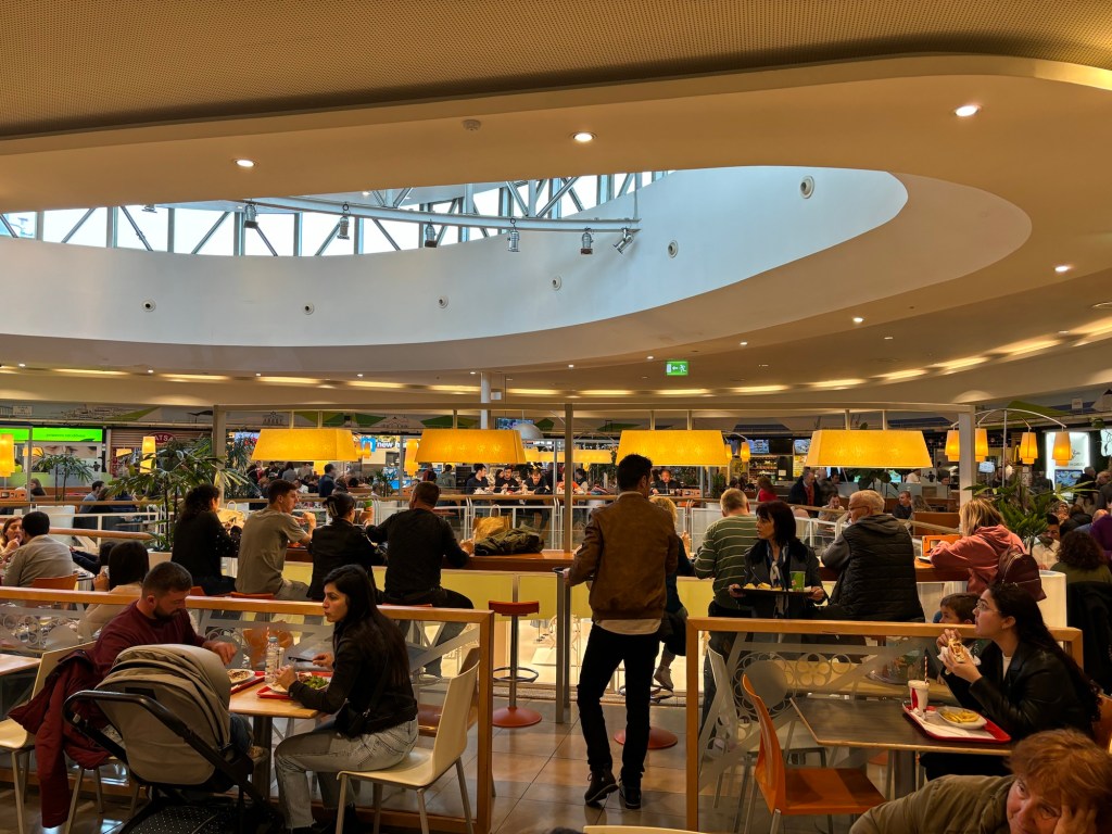 I took the funicular down the mountain and decided I needed a quick bite to eat before I started walking the Way. It is Sunday so everything is closed. I was worried that I would be marching on an empty stomach. Then I walked by a shopping mall, on the Camino. I figured shopping malls everywhere have food courts so I might as well duck into the mall and check it out.