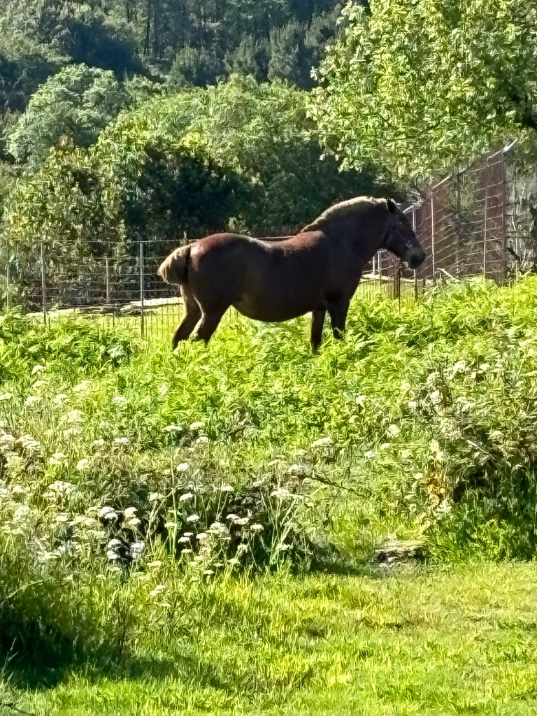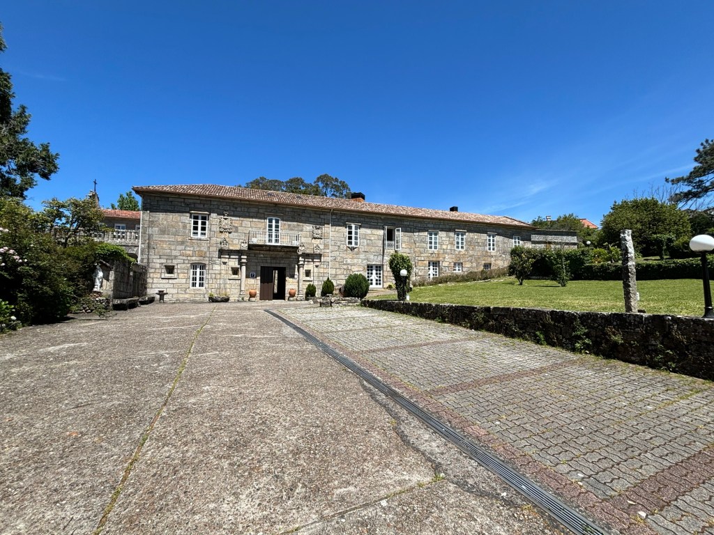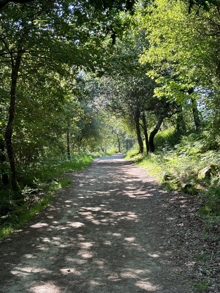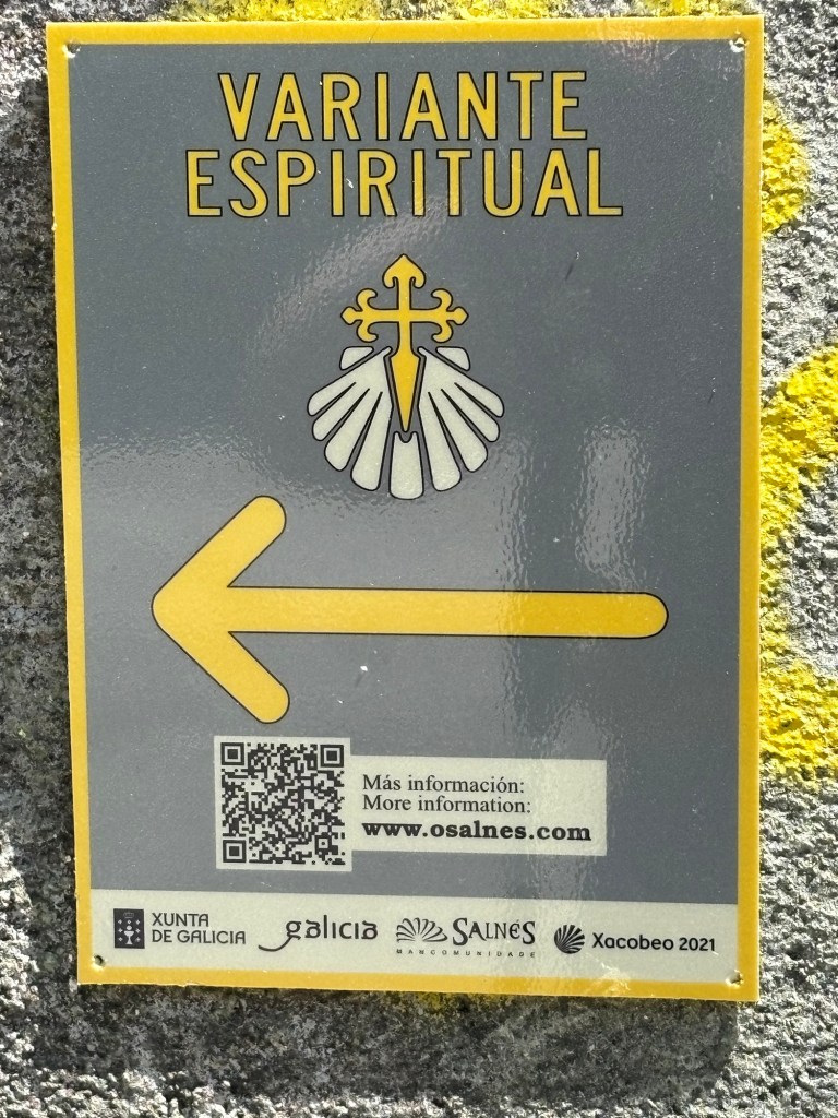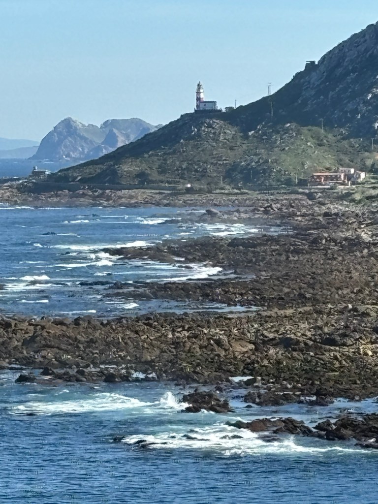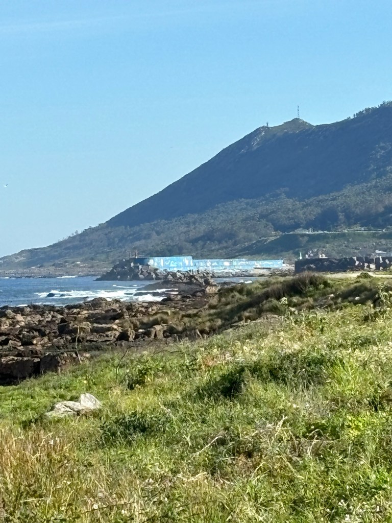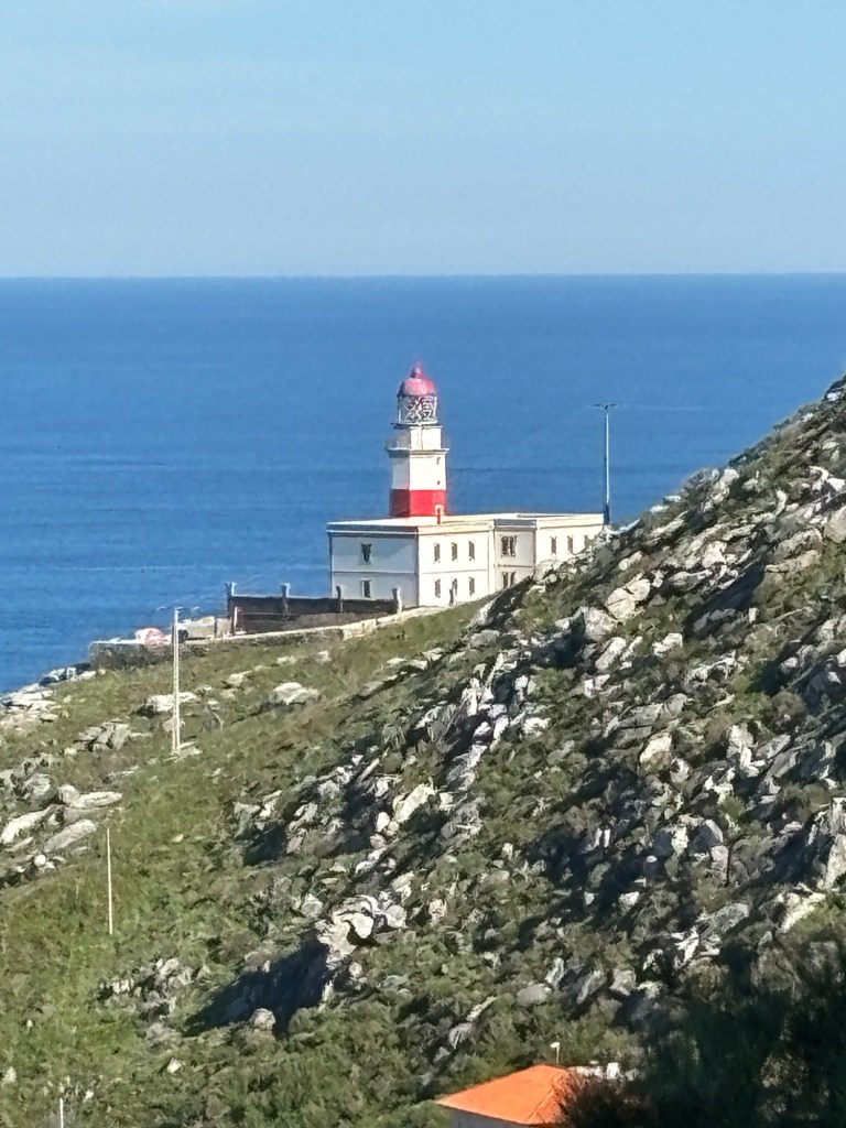 This was right about the time the sun was peeking over the hills to the east of The Way.Interesting roadside Camino art.This coast in southwestern Spain is spectacular.A lighthouse because I know Jan likes lighthouses.The Way today was a mixture of walking/biking paths that hugged the coast and these rough as a cob trails over the hills.It seems like there are a lot of horses in the pastures but we don’t see anyone riding the horses.I stopped in Baiona for lunch. It was noon and they didn’t start serving lunch until 1:00. They invited me to sit at a table outside in the shade and drink beer and enjoy a plate of tapas, which I did. When 1:00 rolled around I had a very nice plate of pasta carbonara.This is my home for the evening, Pazo Pias. It is an old monastery. The common areas and the grounds have a lot of character but the rooms are nothing special.I splurged and got a single room.