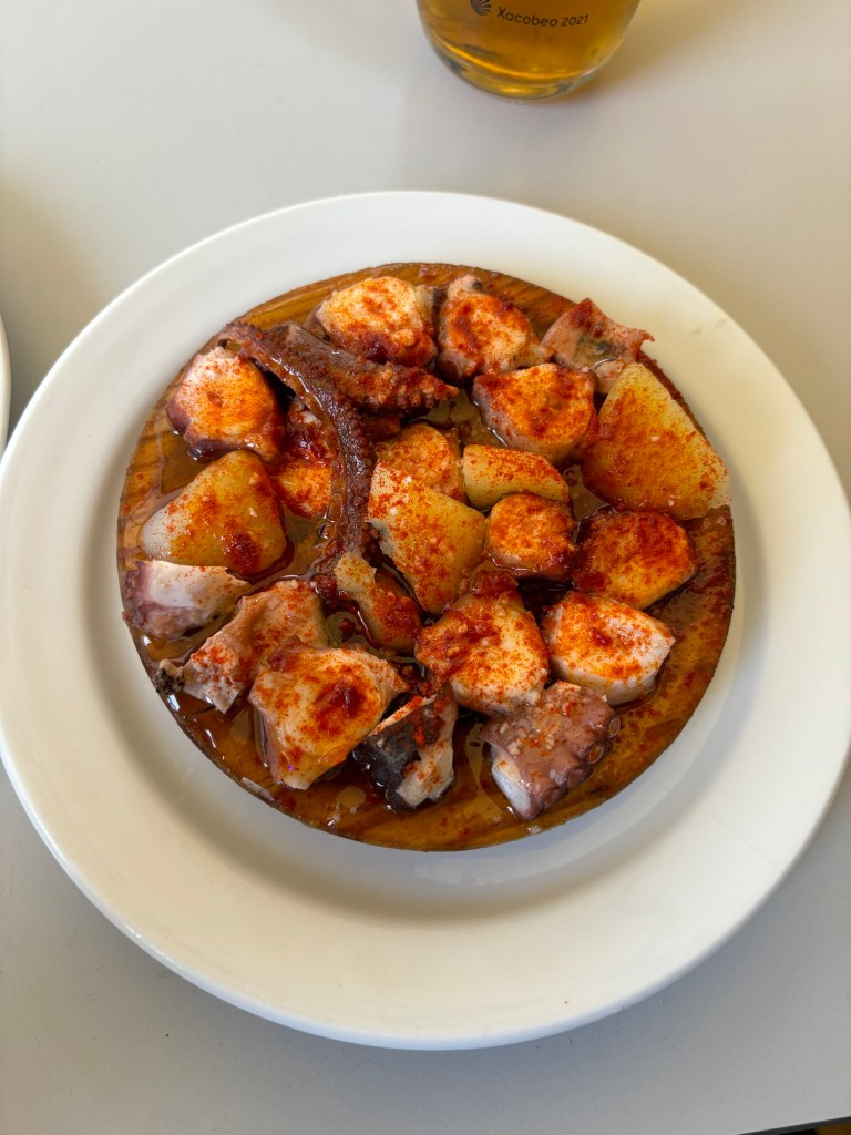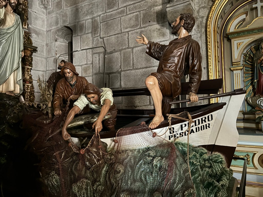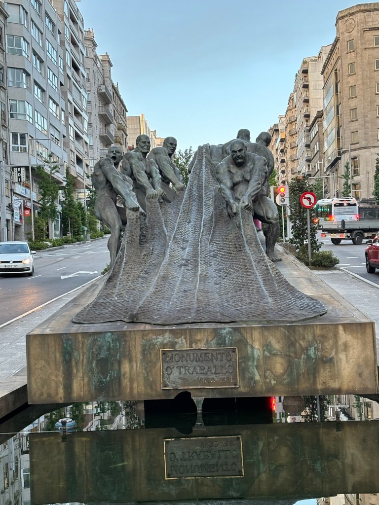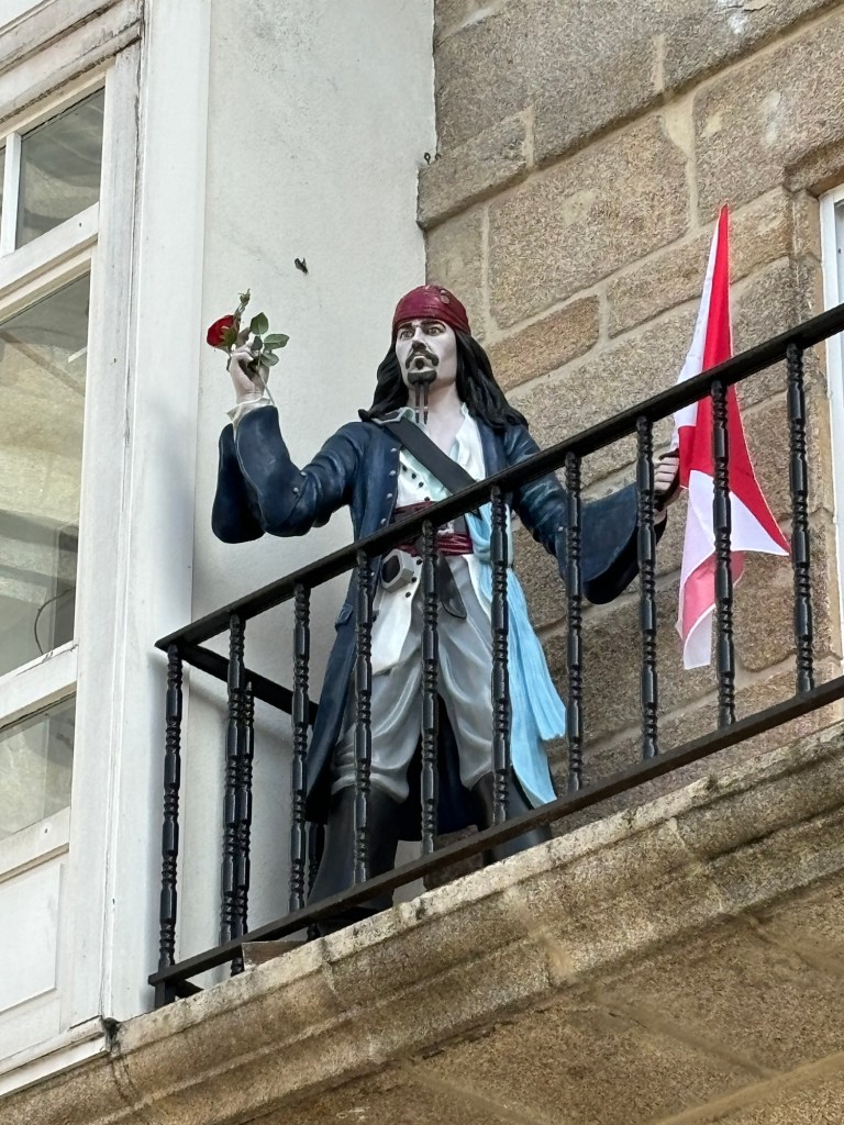 Looking back at A Ramallosa.Praia is beach in Spanish. America is America in Spanish. This was the American beach. Who knows why?The islands in the distance are the Cies Islands. Spain is very proud of the Cies Islands and is trying to get them designated as a UNESCO world heritage site. I was going to take a day off and take the ferry out for a visit. As I checked this out I realized that the only thing you can do there is hike around. Kinda like a busman’s holiday for me. I didn’t want to take a day off from this hike to go out to the Cies Islands and hike.I stopped in a church on the waterfront in Vigo to say a prayer. This statue is a memorial to all the Vigo fishermen who went out to fish and never came back.Vigo is a big port and has a thriving ship repair industry. I walked by almost a half mile of these waterfront shops that were repairing what looked like fishing boats.The workers at these repair shops frequent the taverns that are located across the street from the repair shops. I decided to go local and stop at one of these taverns. My waiter didn’t speak a word of English and did not understand a whole lot of my Spanglish. There was no menu and I finally figured out that there two choices for lunch, meat or fish. Vigo is the home port for a substantial fishing fleet and the tavern was surrounded by fish markets. So, I ordered fish. It was very good.This is my cozy private room in the Colegiate Hostel. It is small and clean with a nice memory foam mattress. It is located on a church square, with church bells ringing every hour. That is quaint until it is bedtime and then it is annoying. Good thing I have heavy duty wax earplugs.This is the church.At Mass at the Church of Saint Mary.After Mass I needed a little snack so I found a place where I could get a beer and a small portion of pulpo 🐙. For those of you who don’t know, pulpo is Spanish for octopus and it is delicious!Johnny Depp is on my balcony. What in the world is he doing there? Do you think he is walking the Camino dressed up like a pirate?