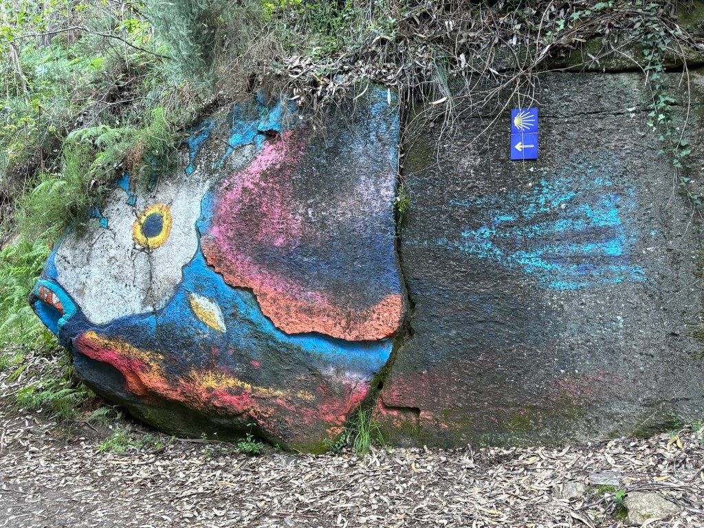 Fish and fishermen are an important part of Vigo, past and present.During my perambulations around Vigo this morning I walked by this huge fish market. You could smell it a block away.Another shot of the Cies Islands. Charlotte from the Netherlands is going to take a day off to ferry out and hike around these islands. Her hospitaleria told her the islands remind people of the Caribbean. That is still not enough to tempt me into taking a day off to hike around these Caribbean like islands.Outside Vigo we walked through a stretch of what looked like rain forest.Many beautiful waterfalls on this stretch of the Way.This is a rock that some very creative person turned into a fish.Great view of the Vigo estuary. We spent most of of the day climbing up to the top of a ridge and then climbing down to walk through a town or village.A bridge over the estuary. I love these level tree shaded sections of the Way.