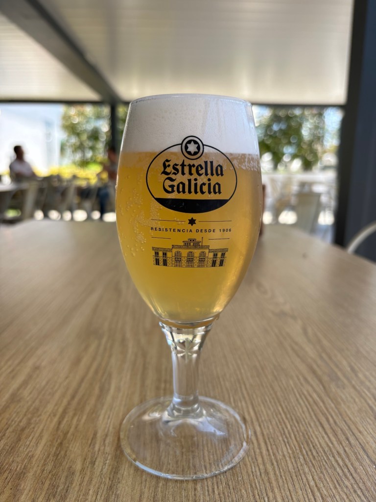 I have a nice lower bunk with sheets and a blanket.And there is a swimming pool. The first rule of swimming pools is that you shower before you get in the pool. I am ashamed to admit that I broke that rule. The minute I checked in I shed my dirty smelly duds and put on my gym shorts/bathing suit. I ran, or rather limped, out to the pool and executed a perfect Memorial Pool/Sandlot belly flop. After about 15 minutes of flailing around the pool like a seal caught in a fishing net I got out and noticed that a brownish oily scum had formed on the surface of the pool. Perhaps it would have been a good idea for me to shower before swimming.This alburgue also has a bar and a restaurant. In the bar they have Radler on tap. I love this place!!!My first, but not last, Radler on this Camino. Cheers!