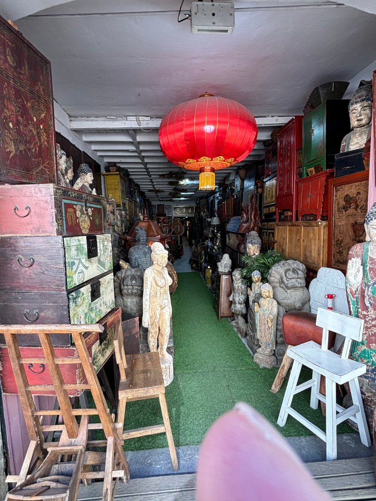 This guy had a long narrow shop where he sold, or was trying to sell, Oriental furniture and knick knacks. It looks like I am walking to the train station along the Camino.