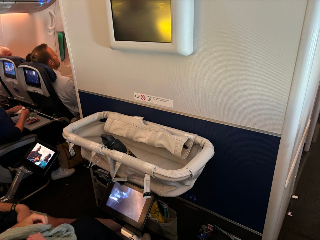 After we took off and got up to our cruising altitude mom fed Oliver and he fell asleep in a bassinet that the flight attendant attached to the bulkhead.