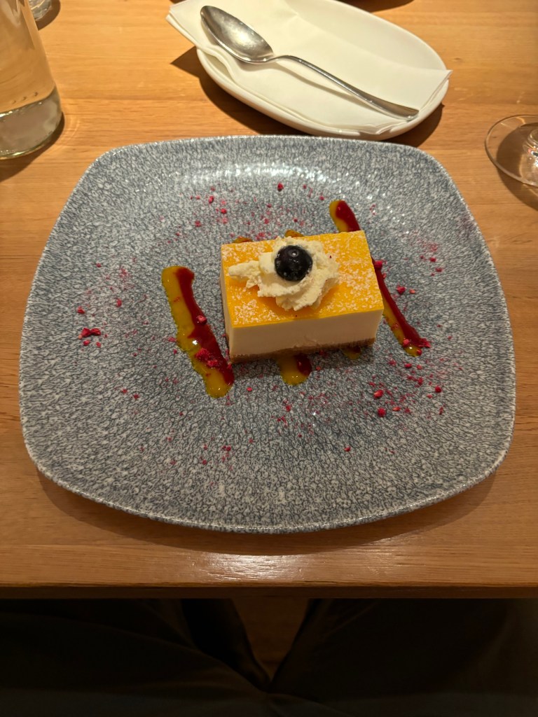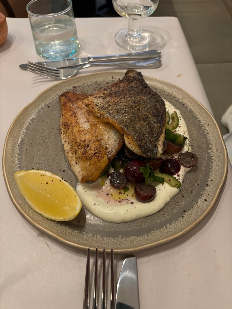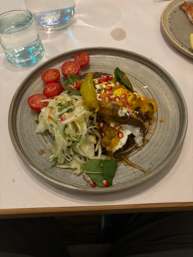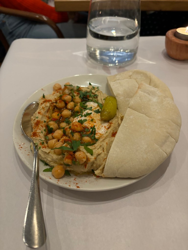 Hummus.Falafel on a bed of hummus.Sea Bream.Lamb shawarma.And for dessert a honey and date cheesecake.
