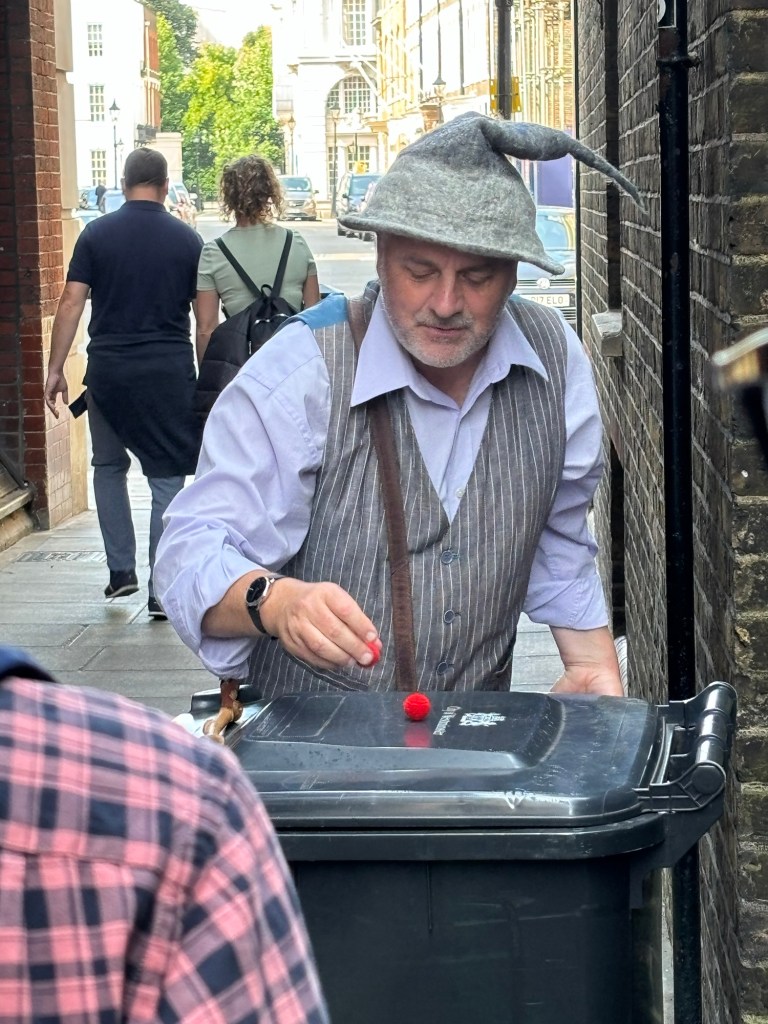 This morning we did a Sandemans Walking Tour of London. It was great and in large part it was great because our tour guide was so great. Herbie was a professional street entertainer from the age of sixteen until he was forty-five, about ten years ago, when his knees gave out on him. He was a tightrope walker and a juggler and a magician. Herbie traveled all over the world performing at busker festivals like the one that was held in Denver in the late 1980s.
