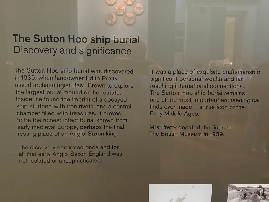 There is a whole wing of the Museum dedicated to objects found at Sutton Hoo and other excavated mounds in England.This is a little hard to read but I recommend you watch a movie about Sutton Hoo and the excavation, called The Dig.Great movie.