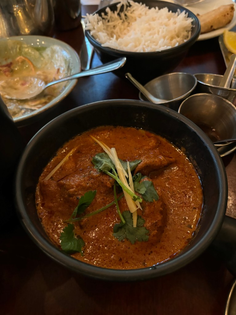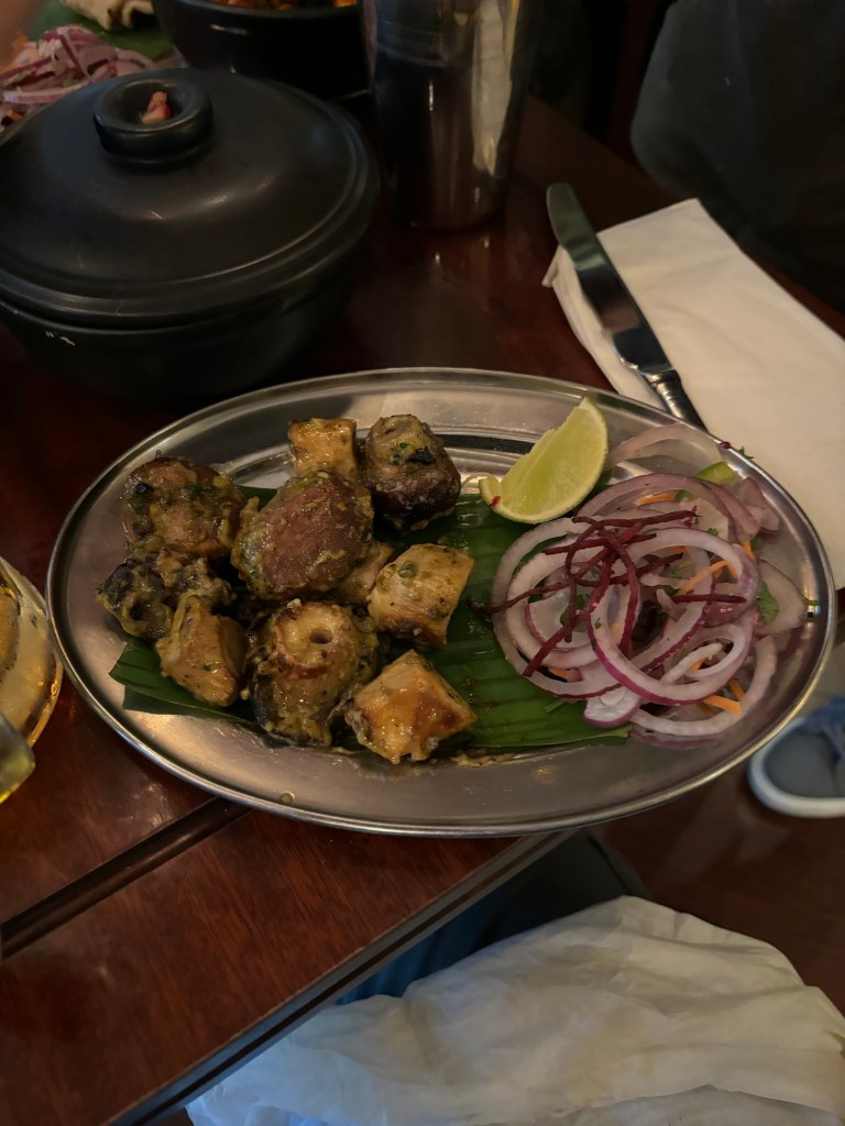 They don’t take reservations so we waited in line outside the restaurant for fifteen minutes before we got a table. It was worth the wait.Mushrooms.Prawns in a curry sauce Chicken curry.