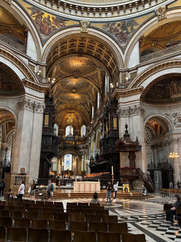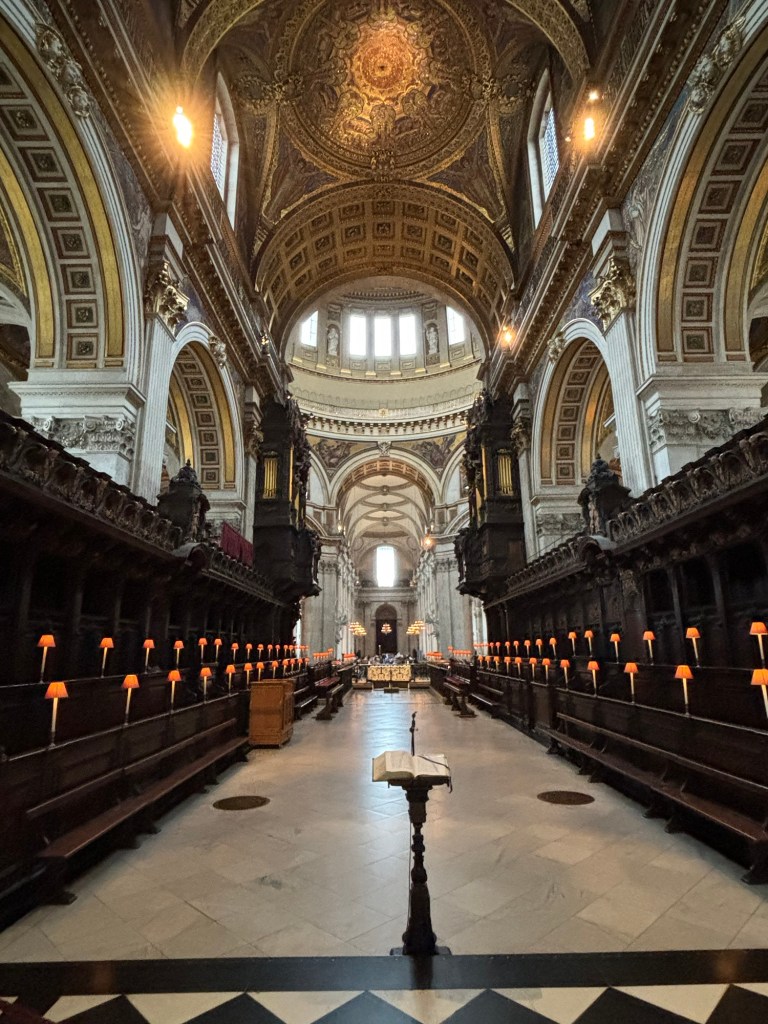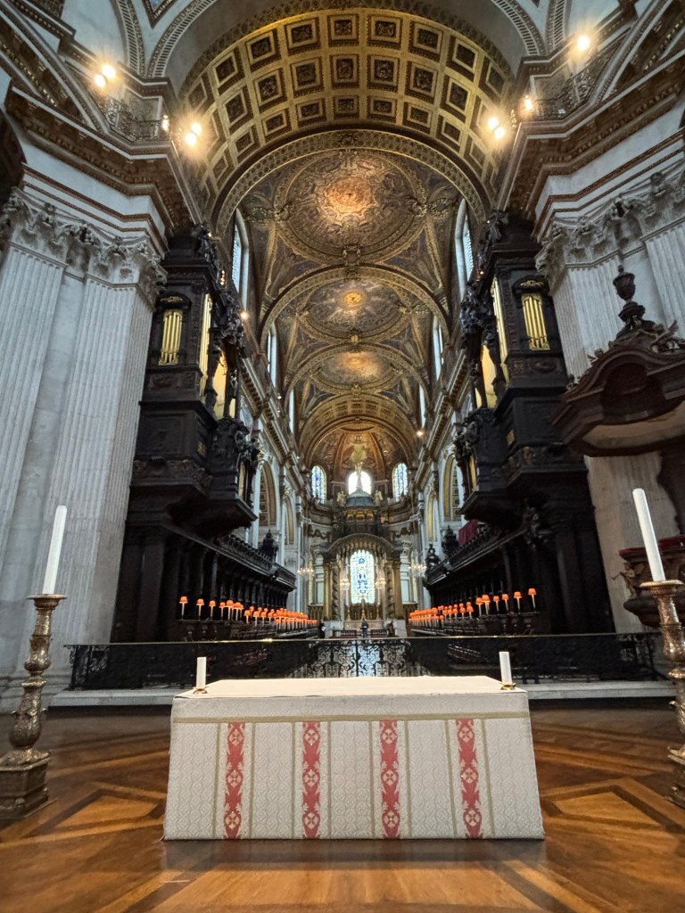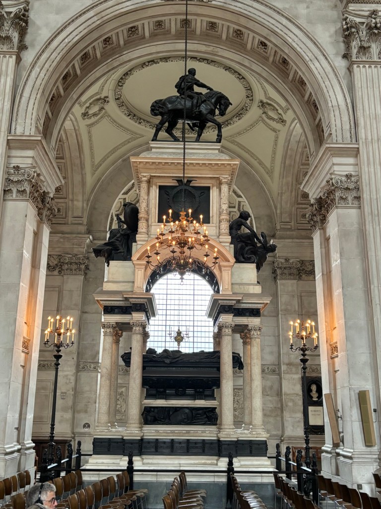 This is a monument to the Duke of Wellington. He is riding his favorite horse Copenhagen.This is a monument to Admiral Nelson.Christopher Wren was the architect of this cathedral and built it in the baroque style of the grand Italian Catholic churches. When Wren finished his masterpiece the Church of England clergy thought that the ornate baroque style of St. Paul’s was not the best fit for future Church of England churches. Thereafter, Church of England churches would be austere and angular. I happen to like ornate and baroque as opposed to austere and angular.View from the altar looking through the choir stalls.The choir stalls.This is a memorial to the American servicemen and servicewomen who died during World War Two.