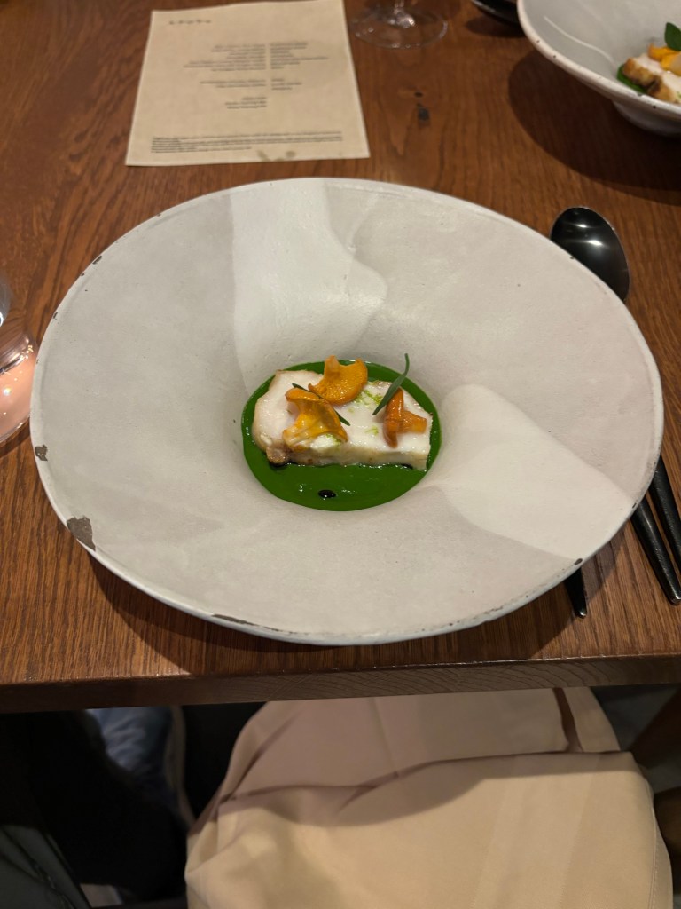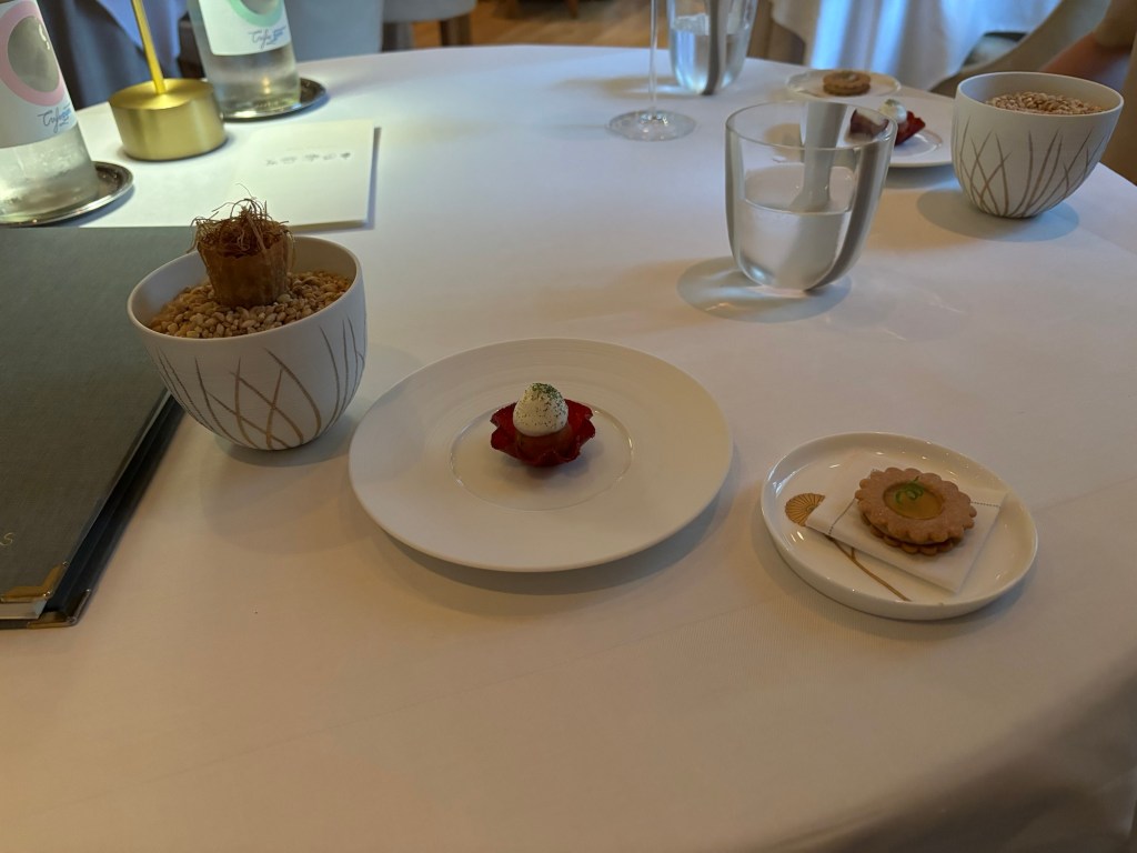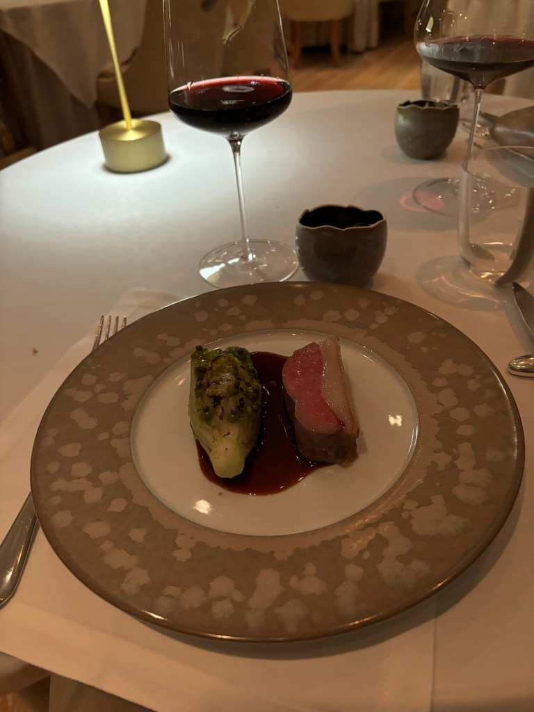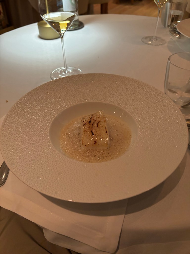 Two seatings at this restaurant and 12 people at each seating.First course. Smoked eel and steak tartare.Second course. Dry aged rainbow trout.Third course. Scottish lobster.Fourth course. Cornish pollock with a leek and mussel reduction.Fifth course. A variety of cuts of pork that were out of this world delicious!Sixth course. A cake and ice cream dessert.Seventh course. A trio of desserts. Starting at 6:00 o’clock, a delicious almond cookie with a dollop of ice cream. At 11:00 o’clock a peach granita. At 1:00 a mulled raspberry delight over a sponge cake.