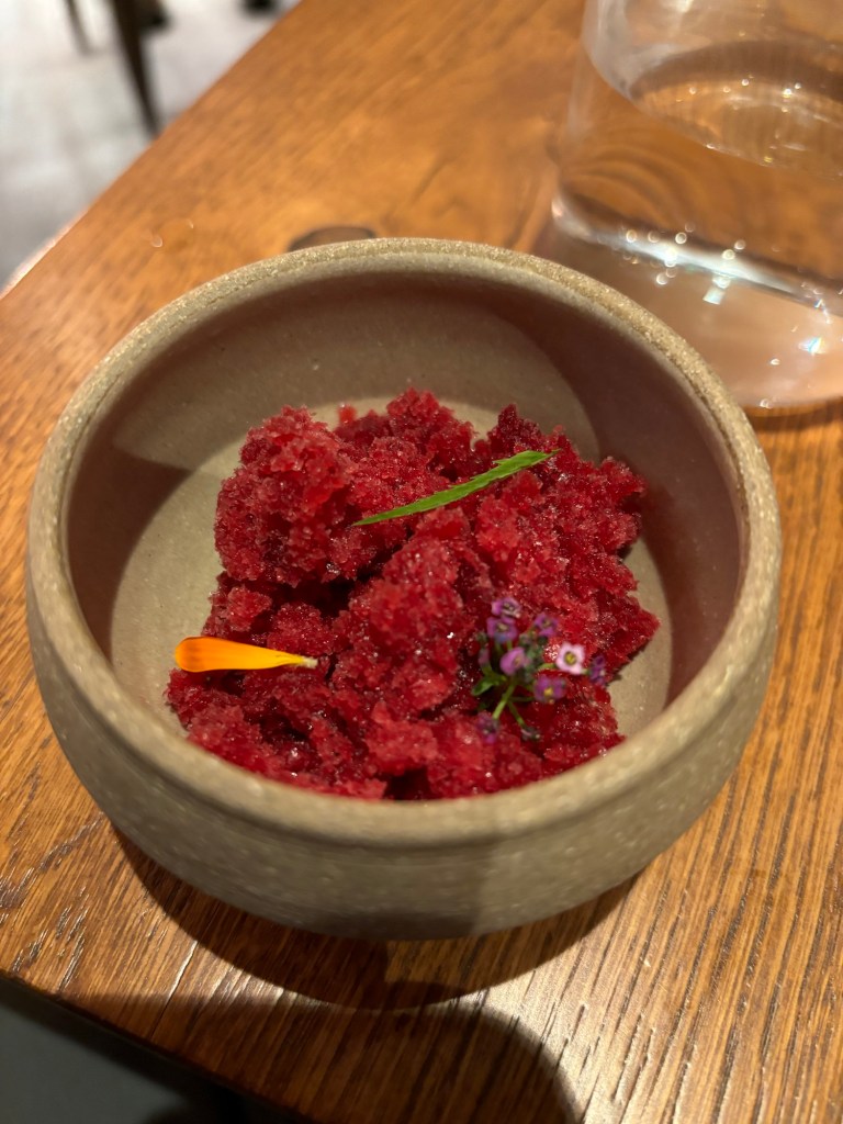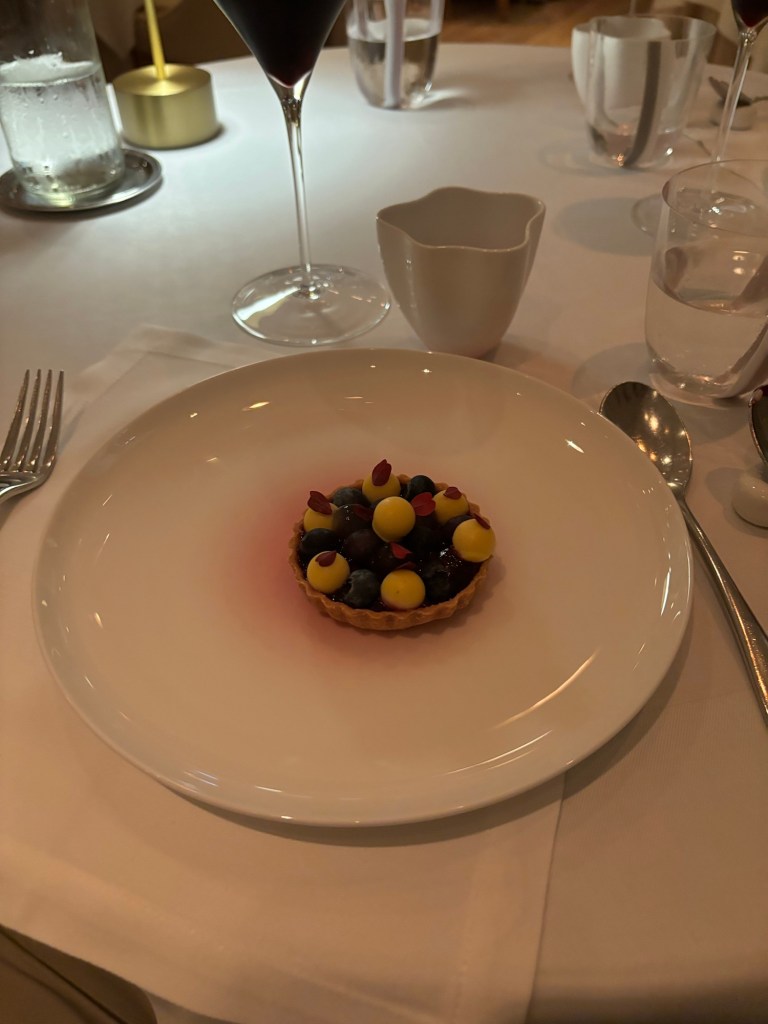 Champagne before dinner.We had dinner at the Five Fields.First course was a trio of shellfish based appetizers.Second course was shredded carrot on top of a scallop.Third course was three beetroot preparations.Fourth course was lobster.Fifth course was turbot.Sixth course was lamb.Seventh course was a raspberry granita.Eight course was a blueberry lemon tart.Ninth course was fresh clotted cream and a panna cotta.