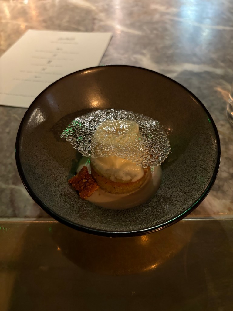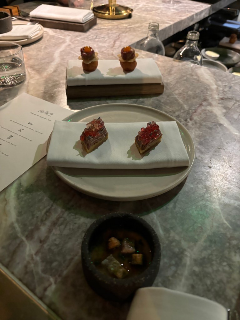 First course was beef tartare.Second course was an Irish oyster.Third course was seared mackerel.Fourth course was monkfish.Fifth course was caviar.Sixth course was a slice of beef tenderloin.Seventh course was ox tongue.